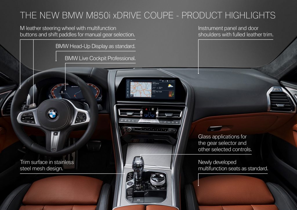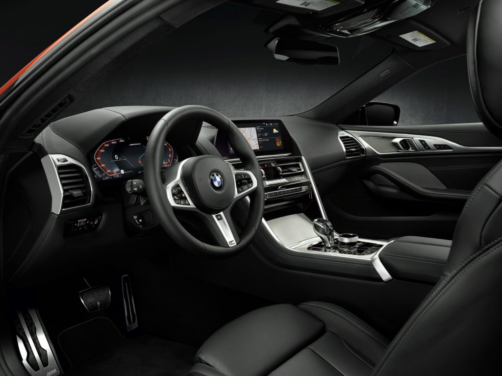 «Восьмерка» оснащена электронной 12,3-дюймовой панелью iDrive и мультимедийным комплексом нового поколения с 10,25-дюймовым дисплеем. Также для взаимодействия с автомобилем предусмотрены клавиши на рулевом колесе, контроллер iDrive, сенсорный ввод, голосовое управление и функция управления жестами. Как и новый BMW X5, 8-я серия также снабжена кнопкой запуска/остановки на центральной консоли и новым рычагом переключения передач.