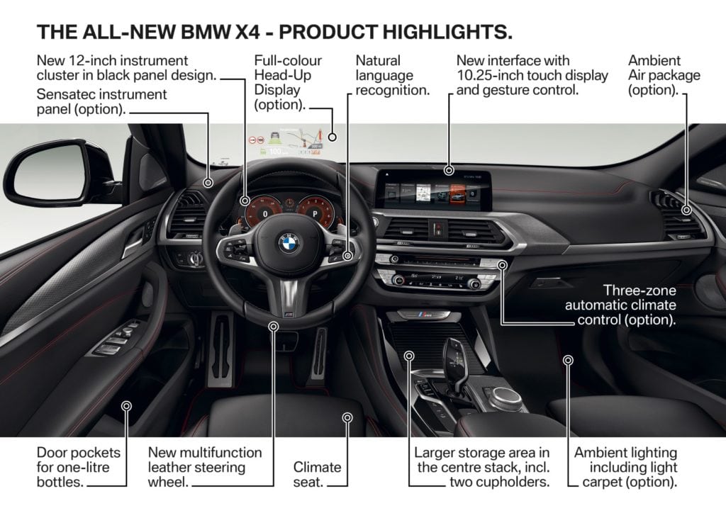 BMW X4 второго поколения оказался заметно крупнее своего предшественника. Габаритная длина выросла на 81 миллиметр (до 4752 миллиметров), а ширина на 37 миллиметров (до 1918 миллиметров). Колесная база новинки равна 2864 миллиметрам, что на 37 миллиметров больше, чем у кроссовера прошлого поколения.