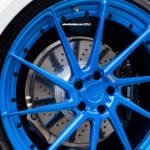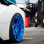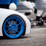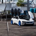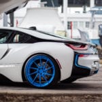 На этот i8 установлены колеса от Wheels Boutique, которые смотрятся просто великолепно. А их шикарный голубой цвет придает дополнительный акцент элементам автомобиля, выполненным в голубом цвете. Помимо этого, машина была дополнительно занижена, что придает ей больше управляемости и спортивности во внешнем виде.