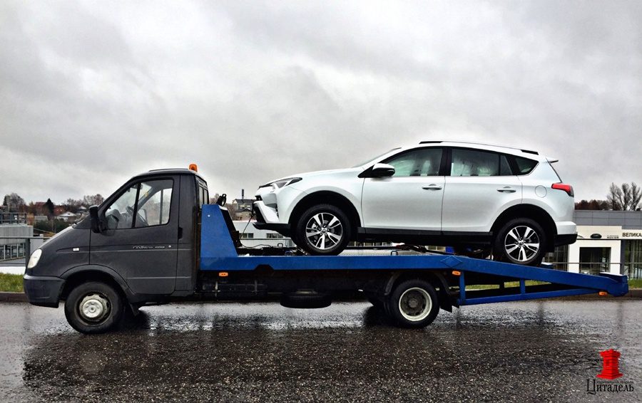 Погрузка автомобиля. Машину аккуратно загружают на платформу, фиксируют ремнями и транспортируют в нужное место — СТО, паркинг, сервисный центр.