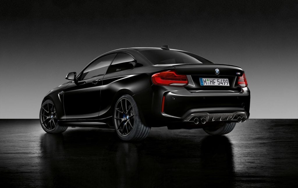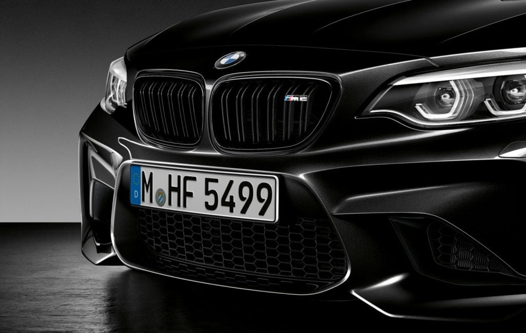 Крышки дверных зеркал с карбоновым дизайном и фирменными черными глянцевыми ноздрями BMW, а также выхлопная система M-exhaust с декоративной отделкой из черного хрома усиливают мрачный антураж BMW M2 Black Edition.